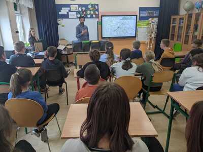 Prelekcja o segregacji odpadów. W dniu 10 października 2023r. dla uczniów klas V-VIII została przygotowana przez pracowników Zakładu Gospodarki Komunalnej p. Anne Stopierzynska i p.Huberta Sikora pogadanka informacyjno -edukacyjna dotycząca prawidłowego segregowania odpadów....