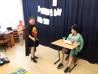 Uczniowie kl. IV podczas przygotowanej w grupach inscenizacji opartej na tekście A. Mickiewicza pt."Pani Twardowska"