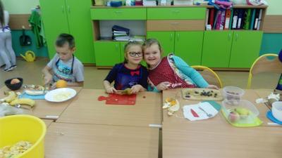 W ramach tematów związanych z jesienią w sadzie i ogrodzie pierwszaki wykonały sałatkę owowcową. Była przepyszna - mniam, mniam.