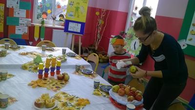 ,,Umiem włożyć już buciki, kurtkę zapiąć na guziki. Chociaż trochę zimno dziś, to na spacer warto iść. Rękawiczki mam w kieszeni, więc nie boję się jesieni. Chociaż trochę zimno dziś,