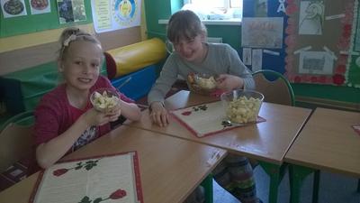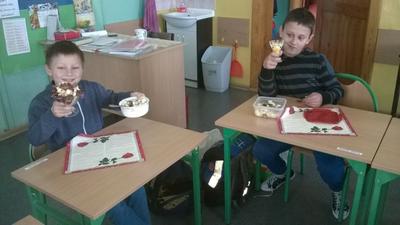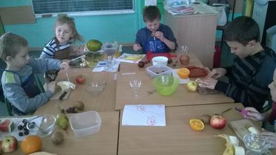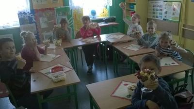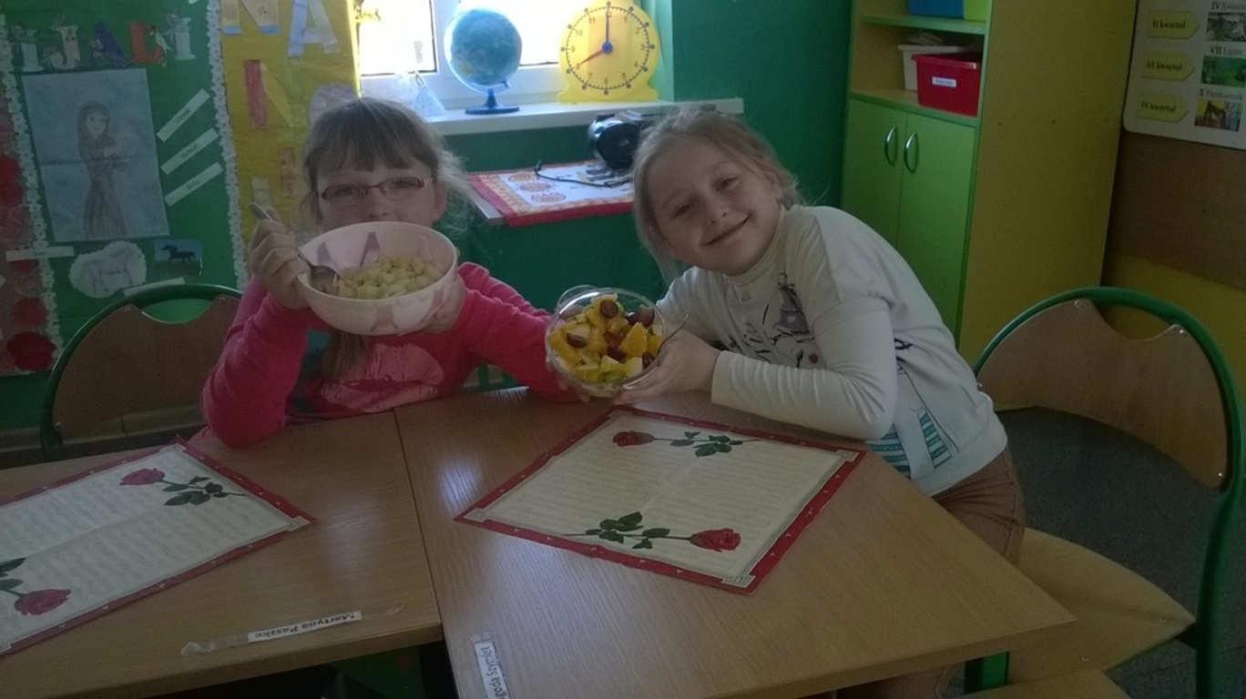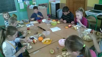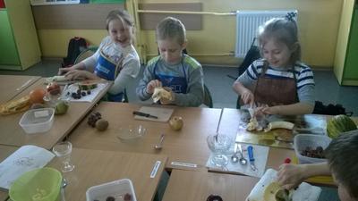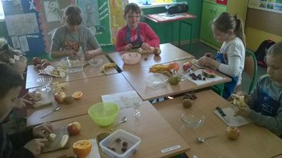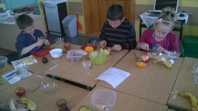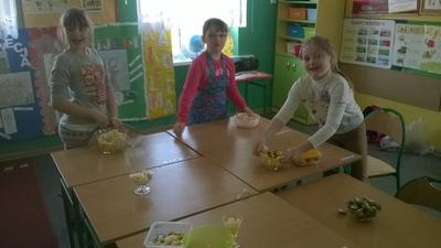 Klasa II na zajeciach plastycznych z pania Monika Tanona własnoręcznie przygotowały pyszną, witaminową sałatkę. Dzieci przyniosły z domów różne świeże owoce. Były jabłka, gruszki, banany, śliwki, brzoskwinie, nektarynki, kiwi, pomarańcze, mandarynki, winogrona, . Wszyscy mieli soczyste minki na widok tak smakowitych owoców i każdy ochoczo zabrał się do pracy. Każdy dostał tackę, nożyk i tak przystąpił do krojenia. Dzieci samodzielnie kroiły i przyrządzały sałatkę owocową przestrzegając zasad bezpieczeństwa przy posługiwaniu się nożem. Przyrządzanie sałatek dało dzieciom wiele satysfakcji jednocześnie uświadamiając jak ważną rolę odgrywają witaminy we właściwym funkcjonowaniu organizmu. Sałatki udały sie!!!!!!!!!! ------były pyszne!!!!!!!!!!!!