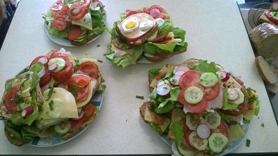 Na stolikach znalazły się: pieczywo, masło, pomidory, papryka, ogórki, sałata, rzodkiewki,ser żółty  oraz szczypior ,natka pietruszki, . Dzieci ochoczo i z zapałem komponowały kolorowe i smaczne kanapki.