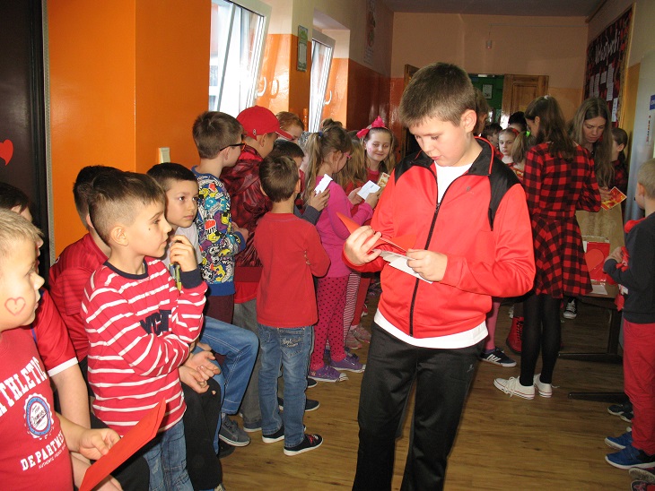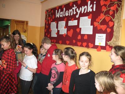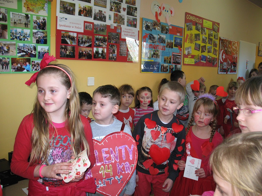 "Sprawcami" walentynkowej atmosfery byli uczniowie z SU, którzy na ten dzień przygotowali różne atrakcje... W piątek 12 lutego dzieci przyszły do szkoły w stroju składającym się z możliwie jak największej ilości czerwonych elementów, za co zostały nagrodzone. Uruchomiono także pocztę walentynkową, co wzbudziło wiele emocji...