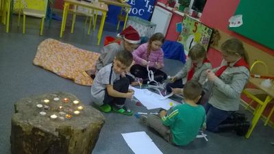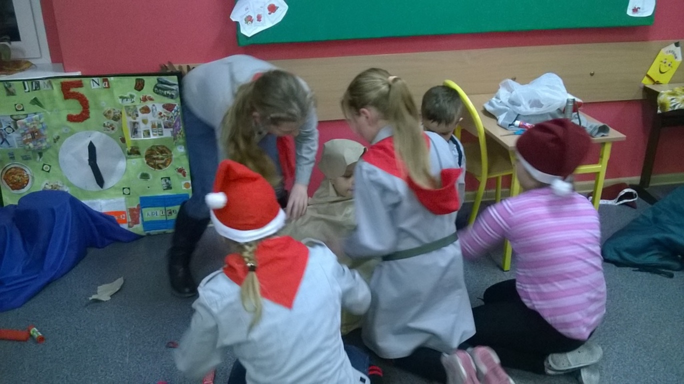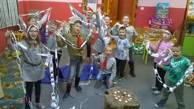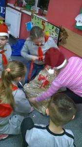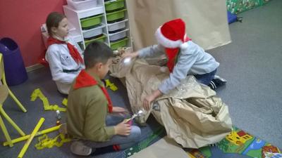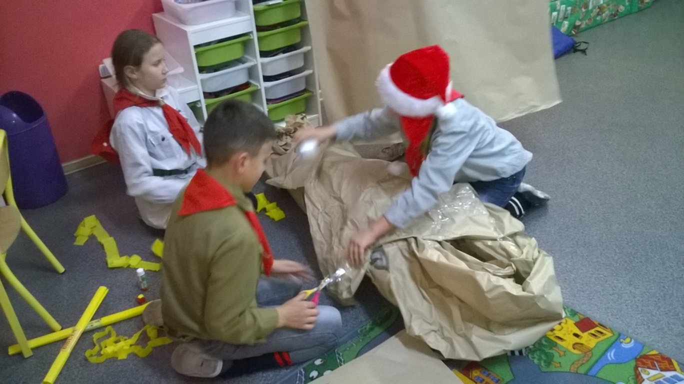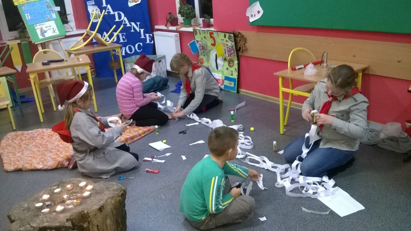 Wszyscy uczestnicy  zostali podzieleni na dwie grupy dla których wyznaczono  zadania do wykonania. Dla wszystkich zuchów było to duże zaskoczenie, bowiem grupy musiały wykazać się znajomością wiedzy o zbliżających się świętach oraz dużą zwinnością i umiejętnościami. W zadumie i z pełnym ainteresowaniem zuchy wysłuchały legendy o Św. Mikołaju oraz wspólnie „pląsali” znakomicie przy tym się bawiąc. Drużyny miały za zadanie ,,zapakować prezent”, przenieść stół z jednego końca sali na drugi z zawiązanymi nogami i rekami, jedzenie na czas pierników od Mikołaja, wykonać łańcuch na choinkę oraz ułożyć puzzle . Po tak wyczerpujących zadaniach nadszedł czas na zasłużony, własnoręcznie przygotowany przez grupę posiłek wieczorny. Po kolacji nadszedł czas na naukę nowych pląsów i oglądanie filmu. Ostatnim punktem programu był przyjście Św. Mikołaja z upominkami oraz rozejście się do domu.