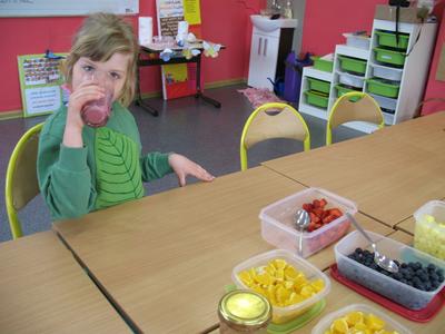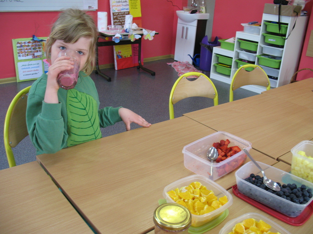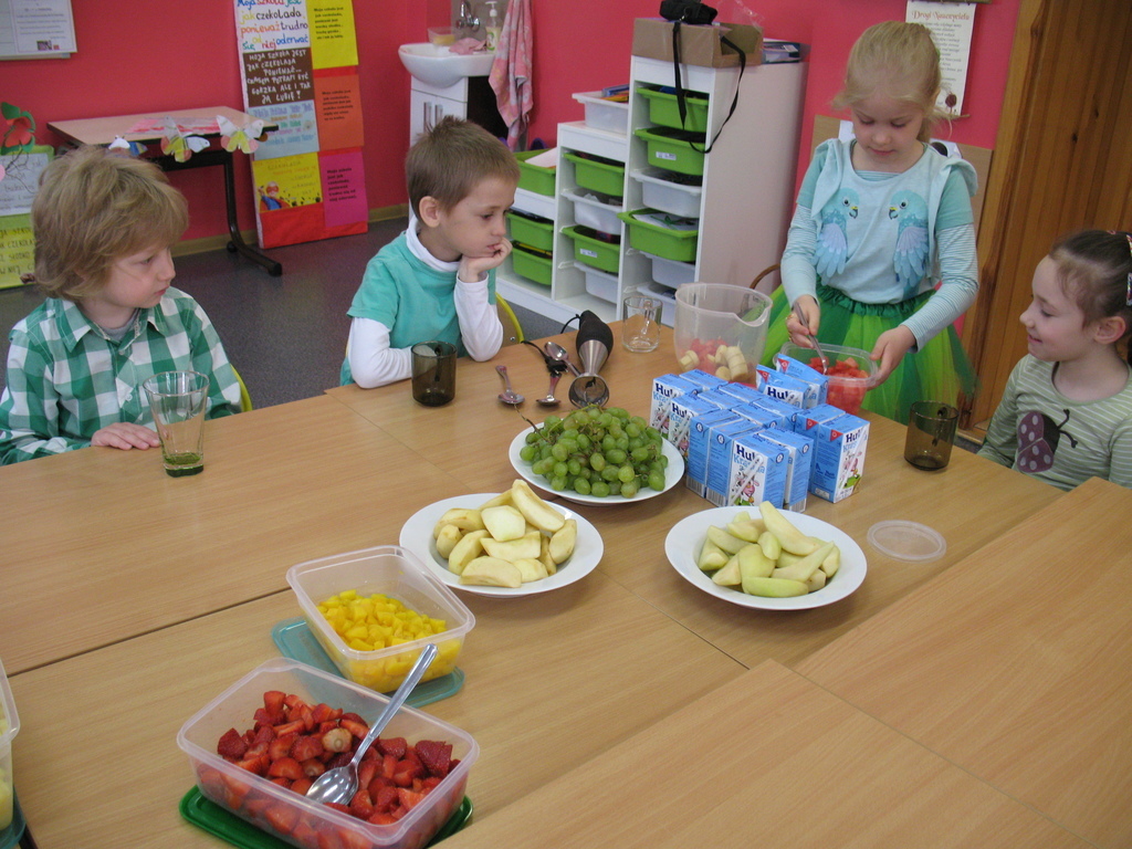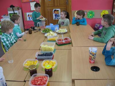 Każdy w domu miał za zadanie z rodzicami pokroić owoce. Na stole znalazły się :-truskawki, borówki, jabłka, gruszki, brzoskwinie, maliny, ananas,winogrona, kiwi, arbuz . Na koniec wszyscy skosztowali zdrowych koktajli, które wszystkim bardzo smakowały.
