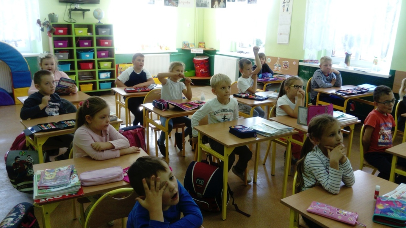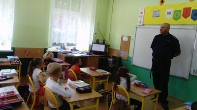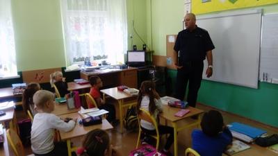Gościem klasy I był policjant z lwóweckiego Posterunku Policji asp. szt. Paweł Kortus. Tematem spotkania było przede wszystkim bezpieczeństwo. Policjant rozmawiał z dziećmi o bezpiecznym poruszniu się po ulicach a w szczególności omówił zasady bezpiecznej drogi do i ze szkoły oraz pokazał niektóre znaki drogowe. Przypomnaił również o koniecznościach noszenia odblasków przy ubraniu lub tornistrze oraz jak należy zachować się, gdy zaczepi nas obca osoba.