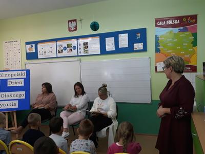 Celem akcji było promowanie głośnego czytania dzieciom oraz kształtowanie wśród uczniów postawy czytelniczej. Tego dnia w szkole gościły Pani dyrektor Renata Marciniak oraz mamy naszych uczennic Pani Agnieszka Rałowicz oraz Pani Agnieszka Haufa. Goście przeczytały uczniom fragmenty książek pt. ,,Pięciopsiaczki” , ,,Gang Słodziaków” oraz ,,Niesamowite przygody dziesięciu skarpetek” tym samym zachęcając dzieci do lektury ulubionych książek. Dzień głośnego czytania upłynął w miłej i radosnej atmosferze, dzieci z zaciekawieniem wysłuchały wszystkich tekstów czytanych, a czytających nagrodziły gromkimi brawami. Nauczyciele mają nadzieję, że ta akcja zachęci uczniów i ich rodziców do częstego wspólnego czytania.