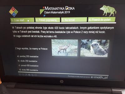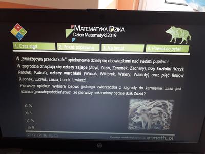 W tym roku hasłem przewodnim była „Matematyka dzika”, a więc pytania związane (luźno) z dziką przyrodą w Polsce. Każda klasa była reprezentowana przez dwuosobowe zespoły. Uczniowie odpowiadali na 24 pytania związane z przyrdą. Njlepszą klasą okazała się klasa VII. drugie miejsce zajęła klasa VI a trzecie klasa V. wszystkim uczestnikom dziękujemy za udział a zwycięscom gratulijemy.
