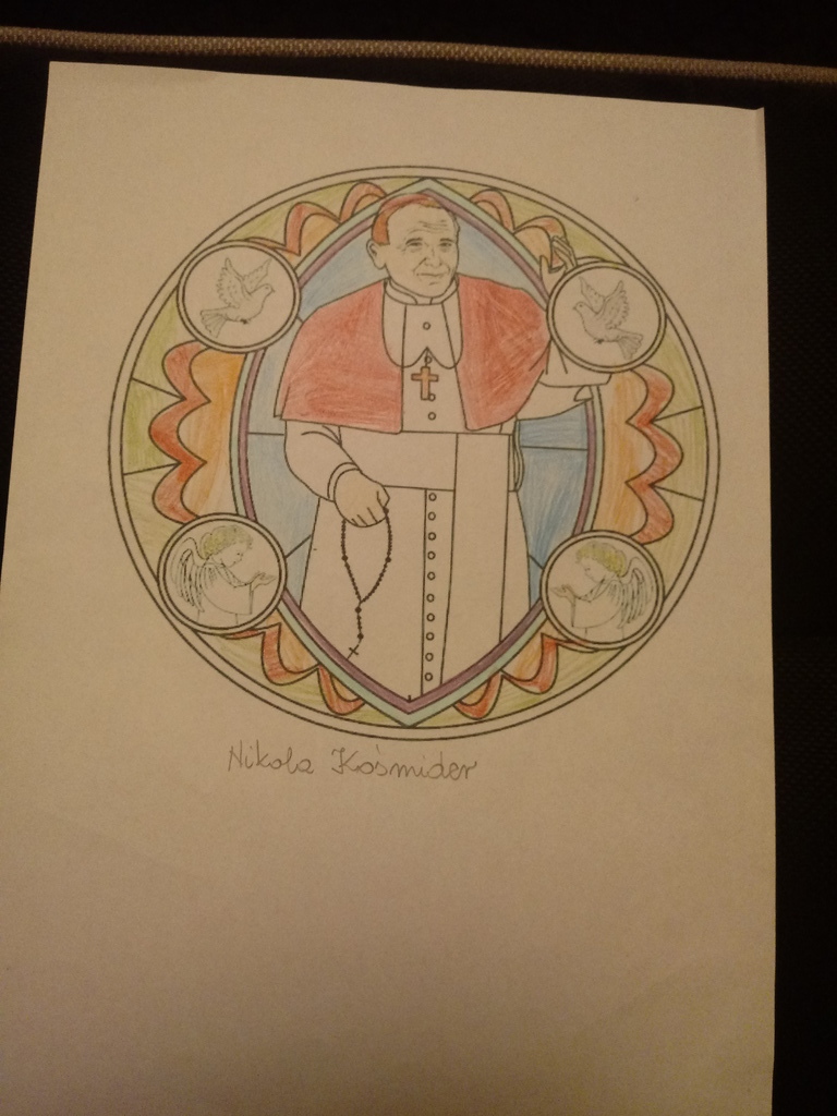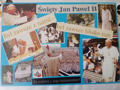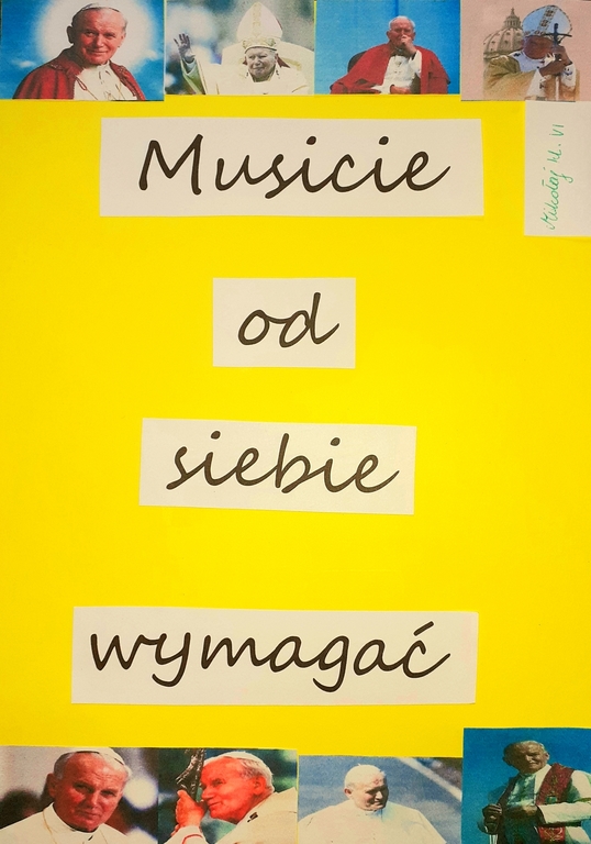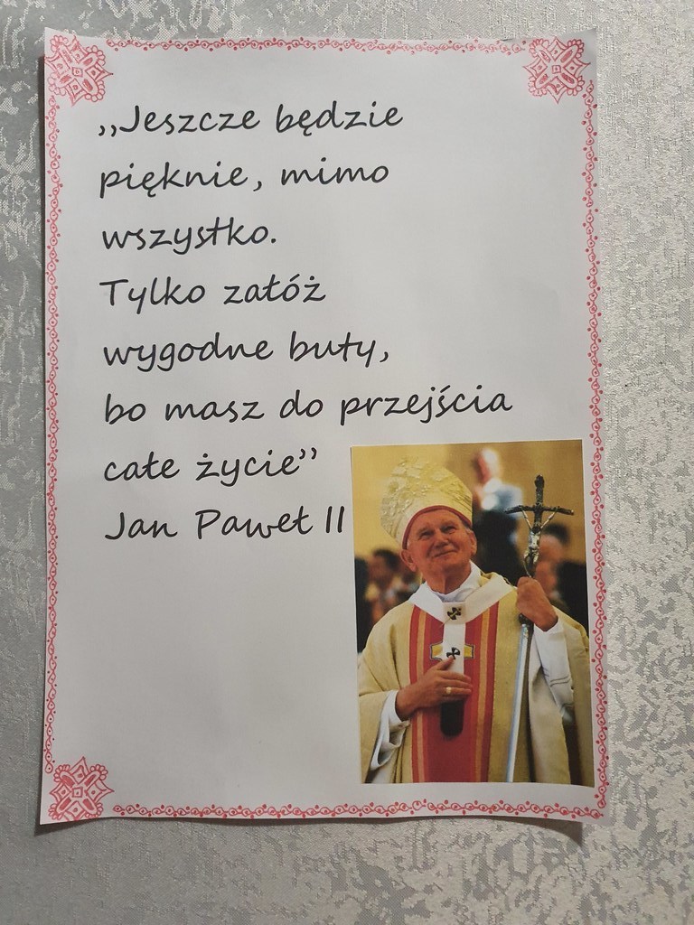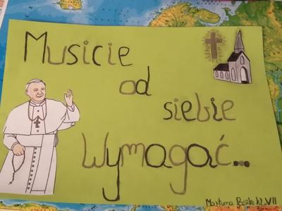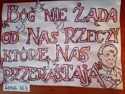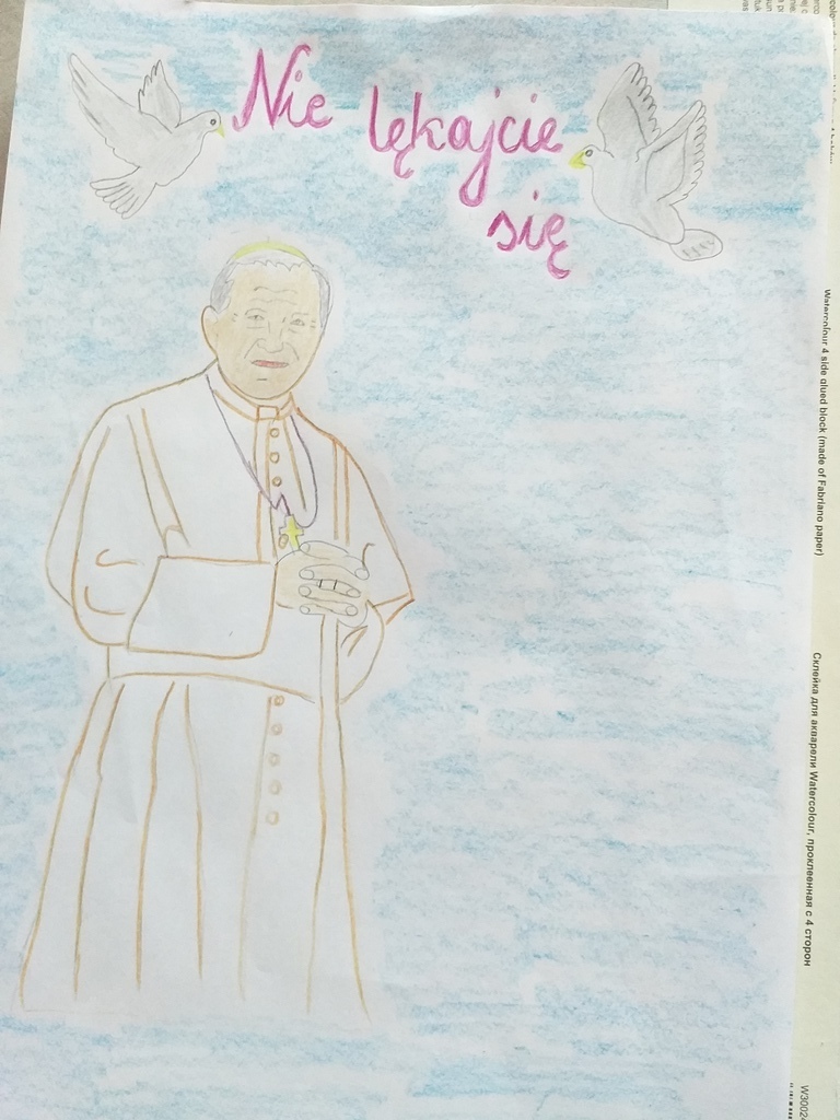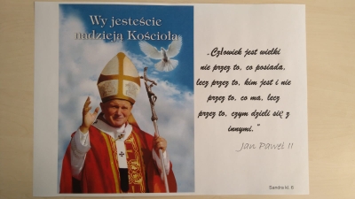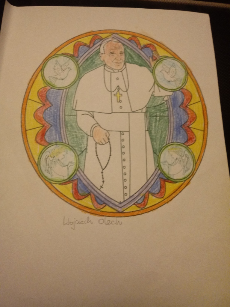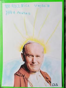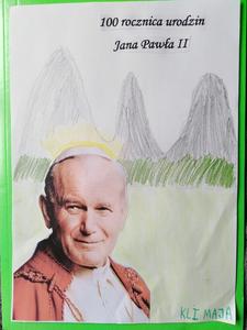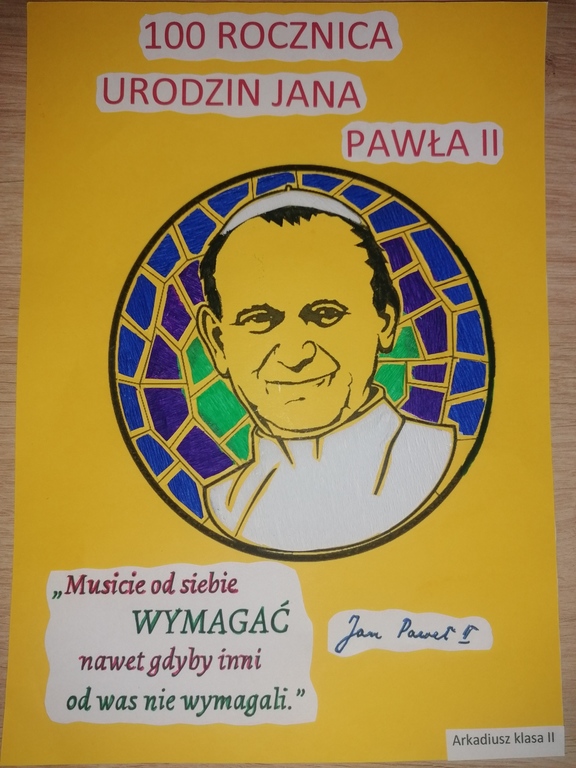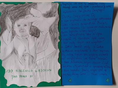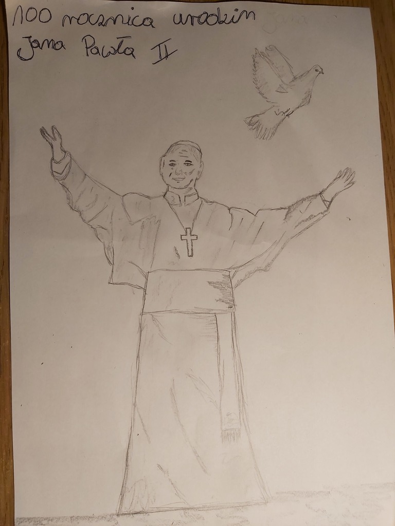 Każdy chętny uczeń, aby uczcić stulecie urodzin Karola Wojtyły, Ojca Świętego Jana Pawła II, naszego Wielkiego Rodaka, mógł przygotować pracę plastyczną i w ten sposób dołączyć do dzieła budowania dobra wspólnego i solidarności – daru dla Jana Pawła II. Dziękuję za zaangażowanie i mam nadzieję ,że wykonanie prac konkursowych było dla was okazją do złożenia hołdu Św. Janowi Pawłowi II .Przypomnieliśmy sobie w ten sposób bogactwo jego życia, osobowość, nie tylko jako biskupa Rzymu, lecz również jako osobę przepełnioną dobrem i szacunkiem do drugiego człowieka.