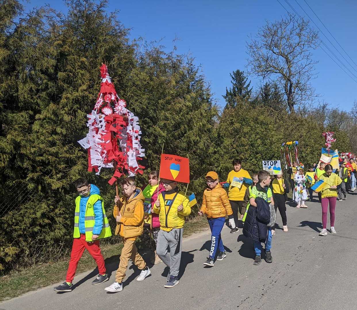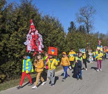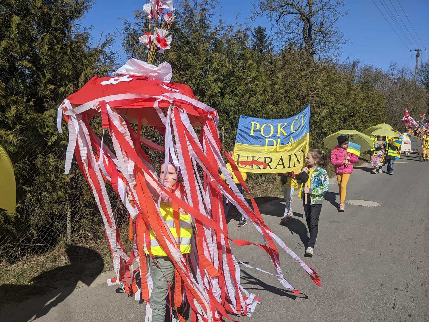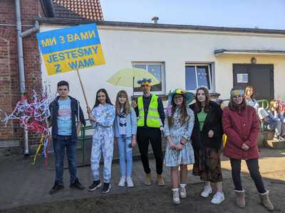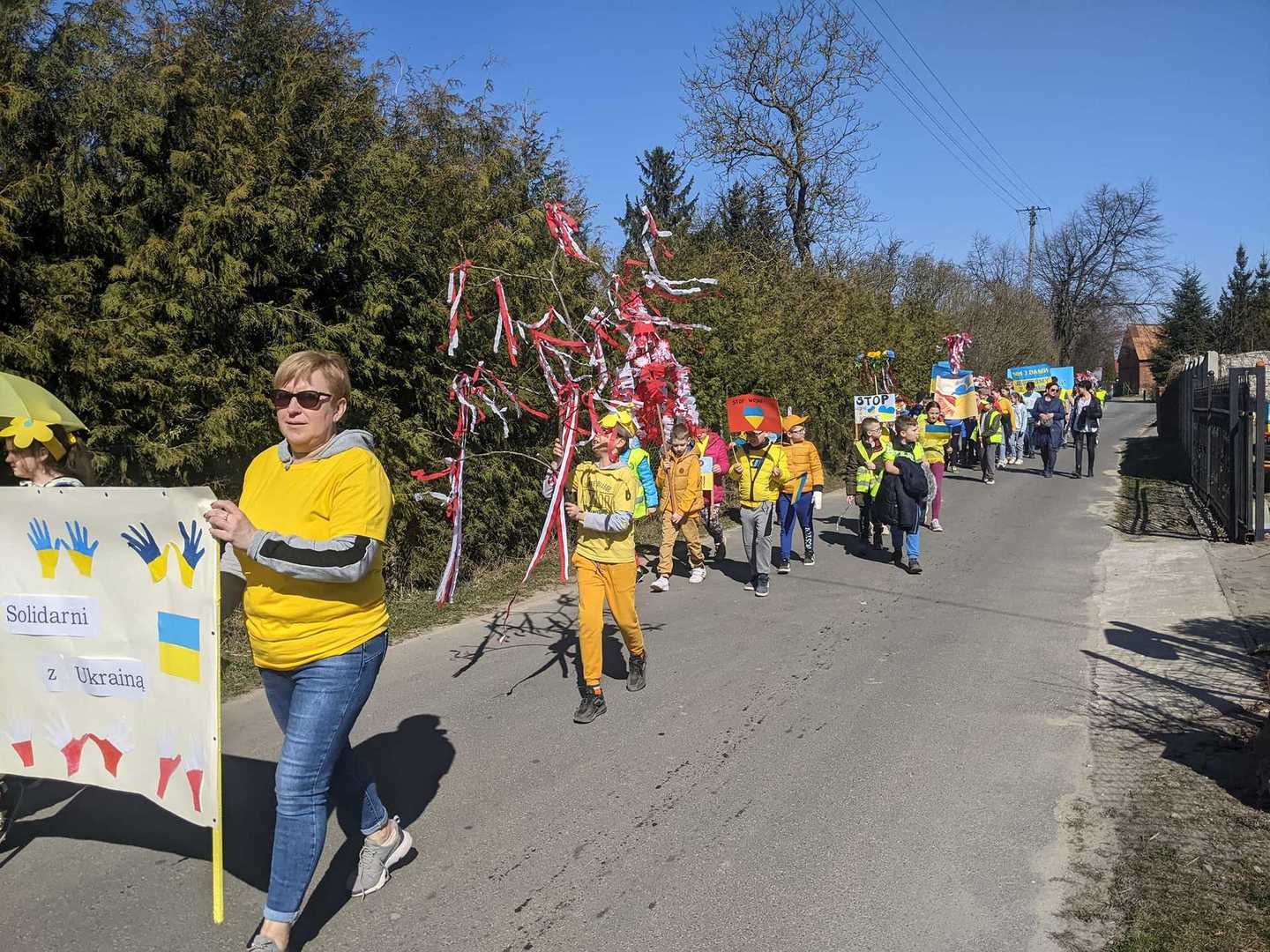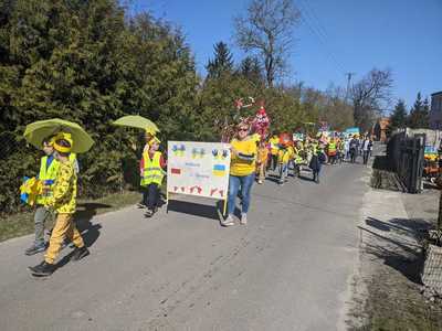 W tym roku szkolny powitanie wiosny przez uczniów naszej szkoły wyglądał troszeczkę inaczej. Kolorem przewodnim nie była zieleń lecz barwy narodowe Polski i Ukrainy. Każda klasa przygotowała transparent, który przedstawiał poparcie dla ludności Ukrainy walczącej o wolność swojego kraju. Natomiast w barwach Polski były gaiki .