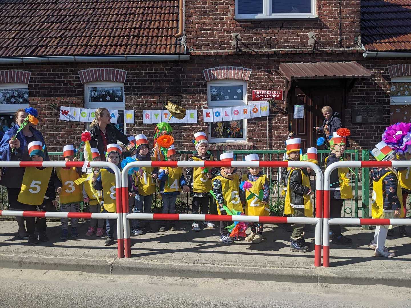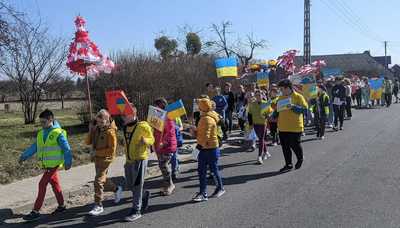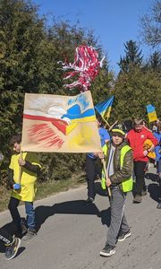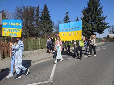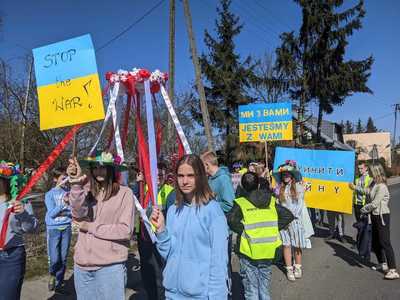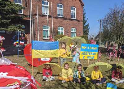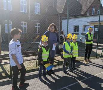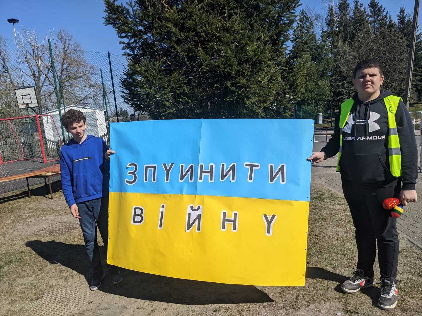 W tym roku szkolny powitanie wiosny przez uczniów naszej szkoły wyglądał troszeczkę inaczej. Kolorem przewodnim nie była zieleń lecz barwy narodowe Polski i Ukrainy. Każda klasa przygotowała transparent, który przedstawiał poparcie dla ludności Ukrainy walczącej o wolność swojego kraju. Natomiast w barwach Polski były gaiki .
