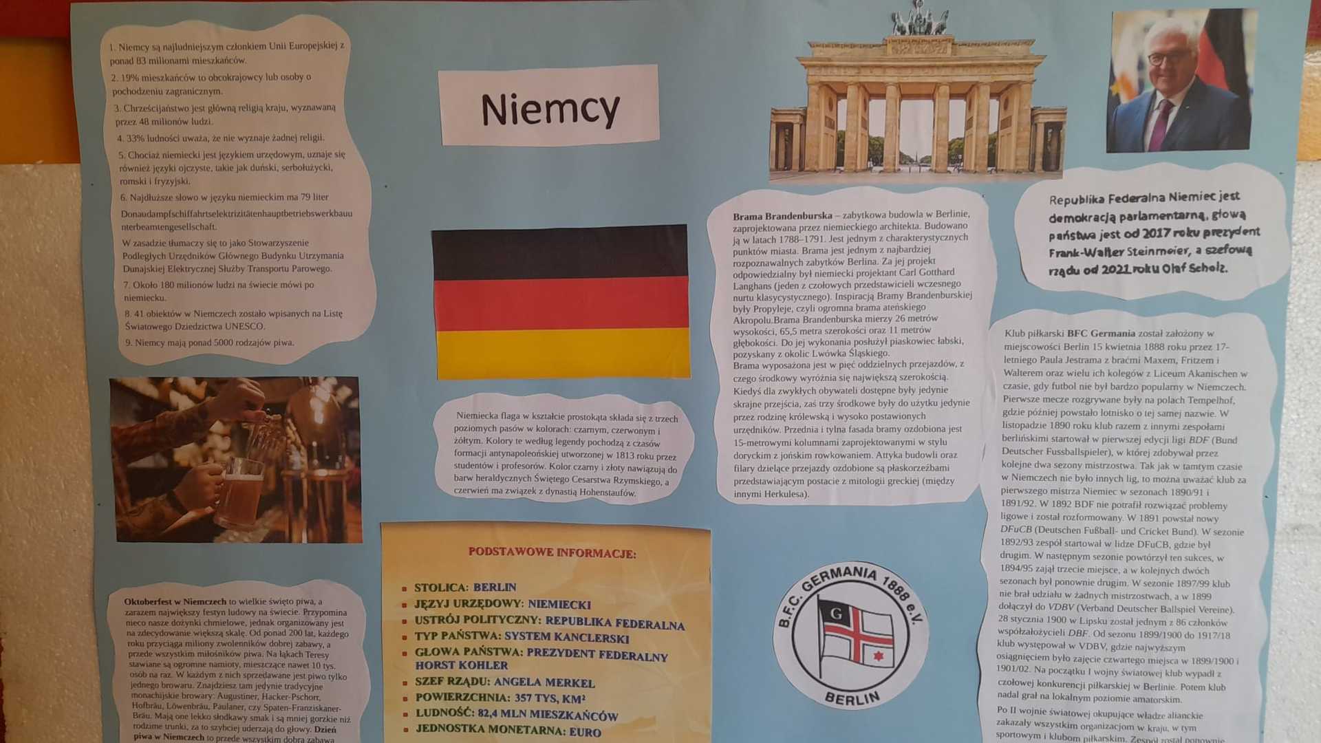 W dniach od 6 do 12 kwietnia w naszej szkole obchodzono Tydzień Kultury Krajów Anglojęzycznych i Niemieckojęzycznych. Uczniowie każdej klasy w drodze losowania zaznajamiali się z innym krajem danego obszaru językowego: kolorowali flagi państw, ubierali się w barwy narodowe, rozwiązywali quiz online na swoich smartfonach oraz wspólnie opracowywali plakat z ciekawostkami o wylosowanym kraju. Nad przebiegiem czuwały i koordynowały prace nauczycielki języka angielskiego p. Małgorzata Bober i języka niemieckiego p. Luiza Dembiecka