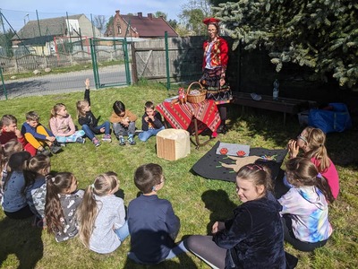 Niezwykli goście przybyli do szkolnego ogrodu w towarzystwie przemiłej opiekunki p. Kasi.