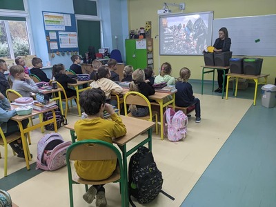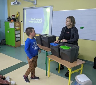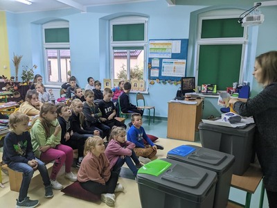 25.10.2023 gościliśmy w naszej szkole panią Annę Stopierzynska z Zakładu Gospodarki Komunalnej która dla uczniów I-IV opowiedziała o prawidłowym segregowania odpadów.