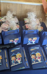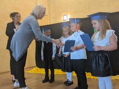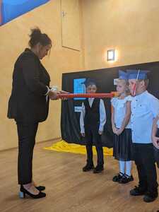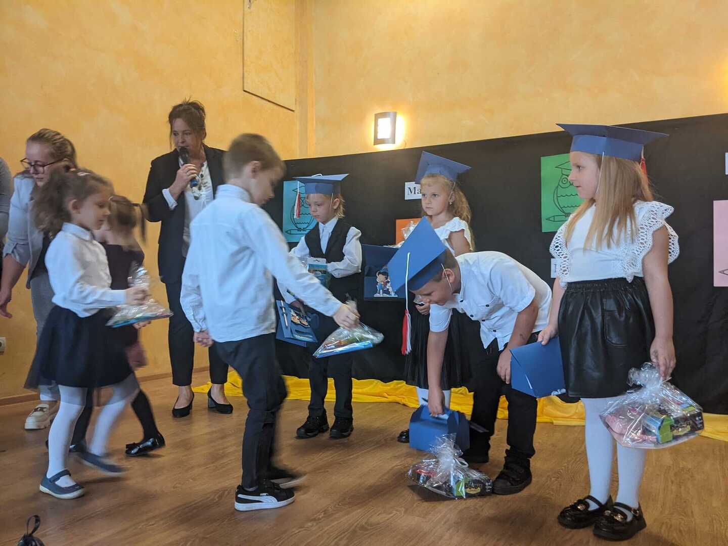 Po złożeniu ślubowania Pani Dyrektor dokonała symbolicznego pasowania na ucznia. Wielka kredką, dotykała ramion swoich podopiecznych.