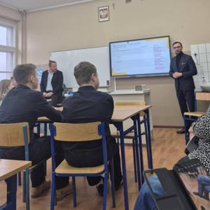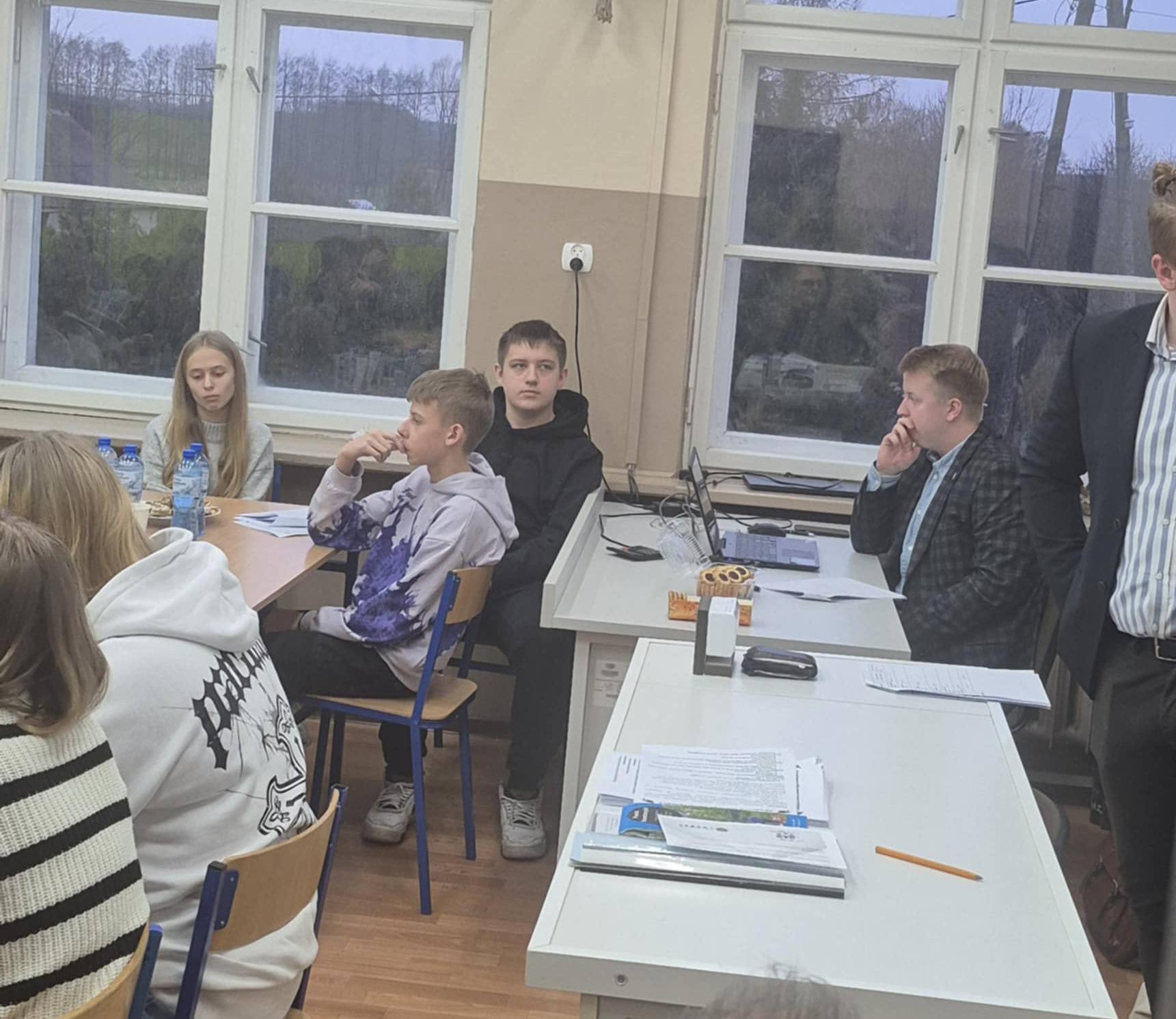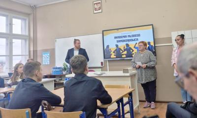 Panowie również aktywnie uczestniczyli w części praktycznej, pomagając młodzieży w rozwiązywaniu zadań problemowych dotyczących spraw powiatowych.