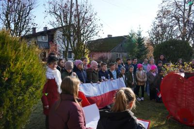 Po wspólnym śpiewie uczennice z klas starszych zaprezentowały krótkie informacje na temat historii Dnia Niepodległości i znaczenia tego święta dla Polaków.