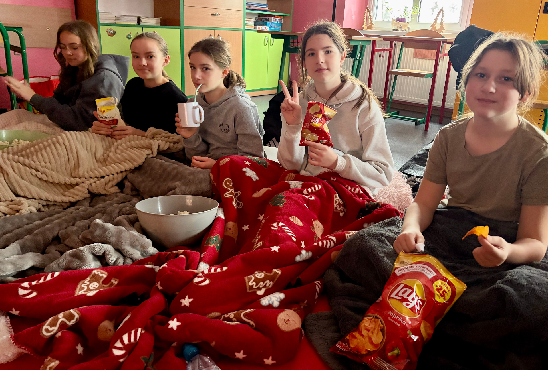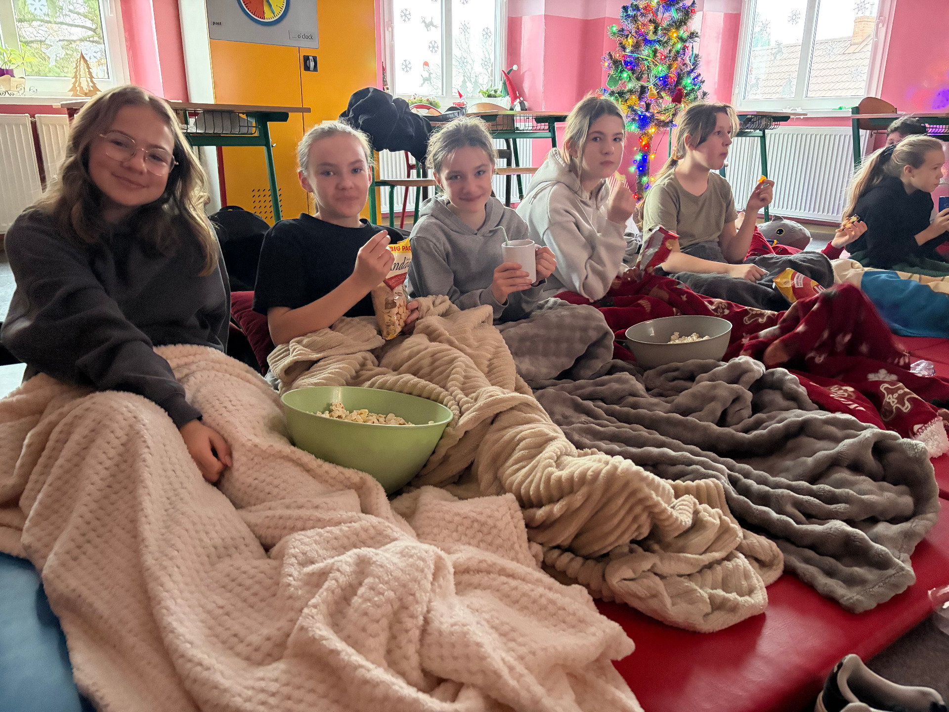 Nie zabrakło kocyków, wygodnych strojów, pysznych przekąsek i cudownej atmosfery. To był idealny moment na wspólny relaks, rozmowy i budowanie klasowej integracji